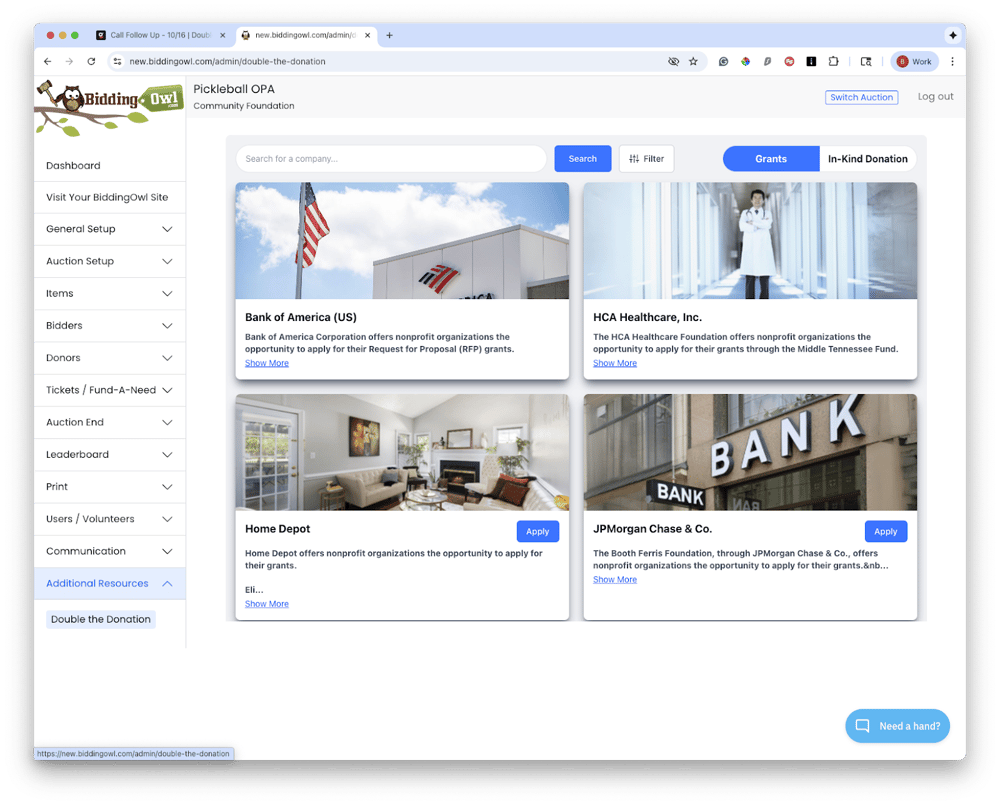 One of the most effective tools for finding corporate donors is the Double the Donation Sponsorship Directory. Because BiddingOwl is a directory partner, users can access this resource directly within their auction management platform. This integration enables you to search for thousands of companies that have already committed to supporting nonprofits through grants and in-kind gifts.
